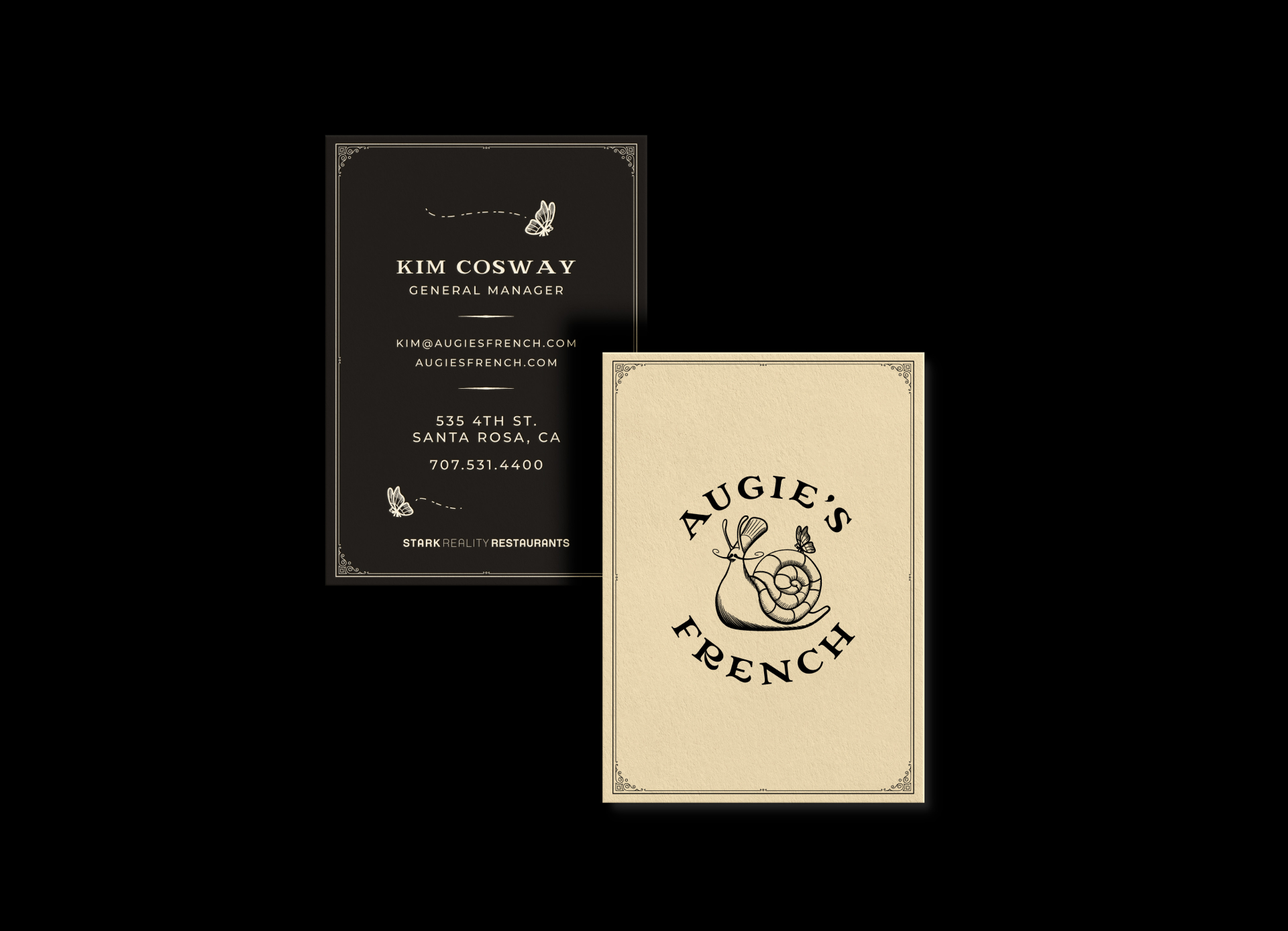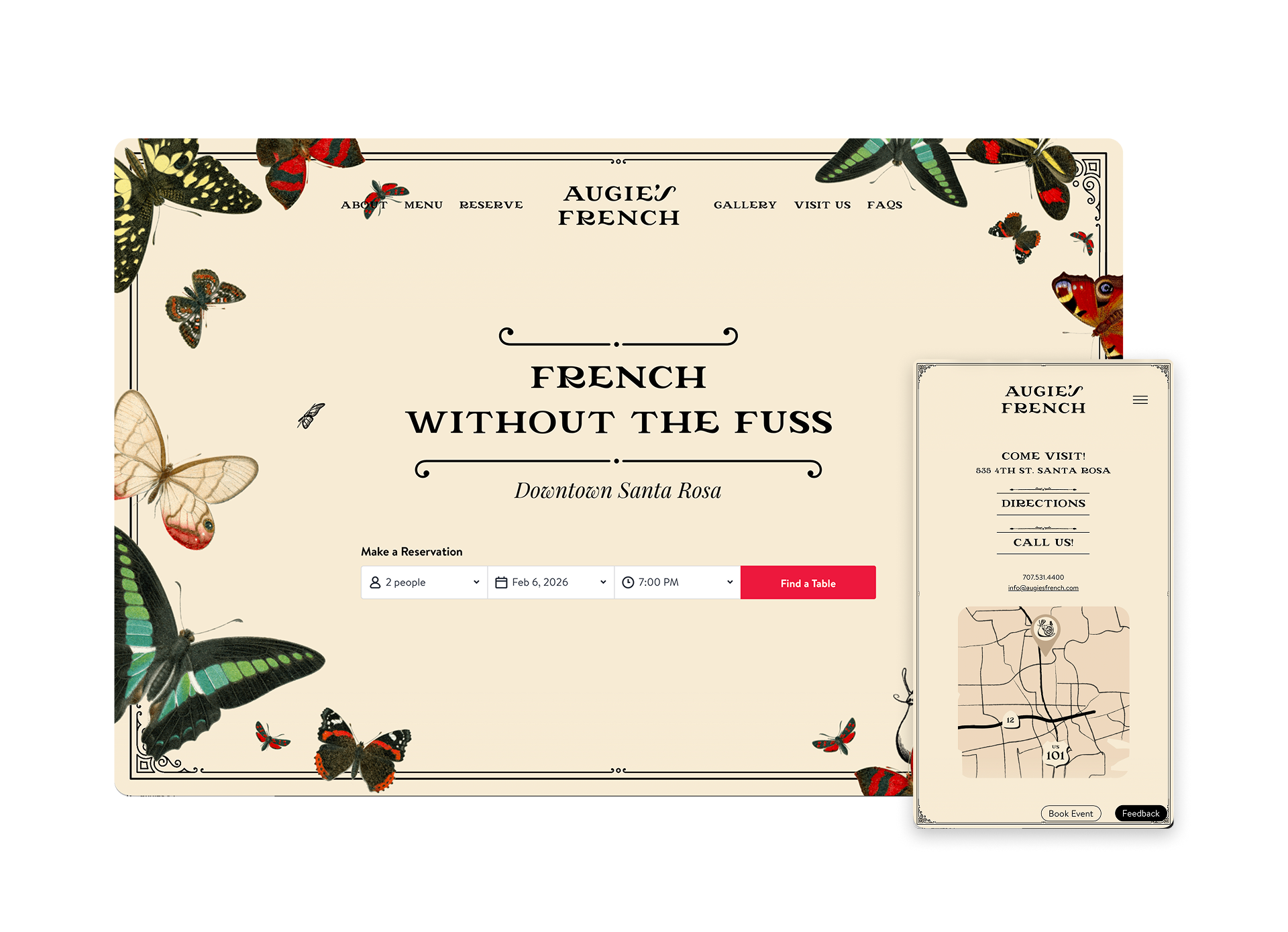 Stark Reality Restaurants approached JAM to design the brand, collateral and website for Augie’s French, a unique bistro in Santa Rosa, CA. We approached this project with a lot of excitement, and a dash of hunger (the photos of the food!). The brand is inspired by the beautiful interiors, wallpaper and décor of Augie's French.